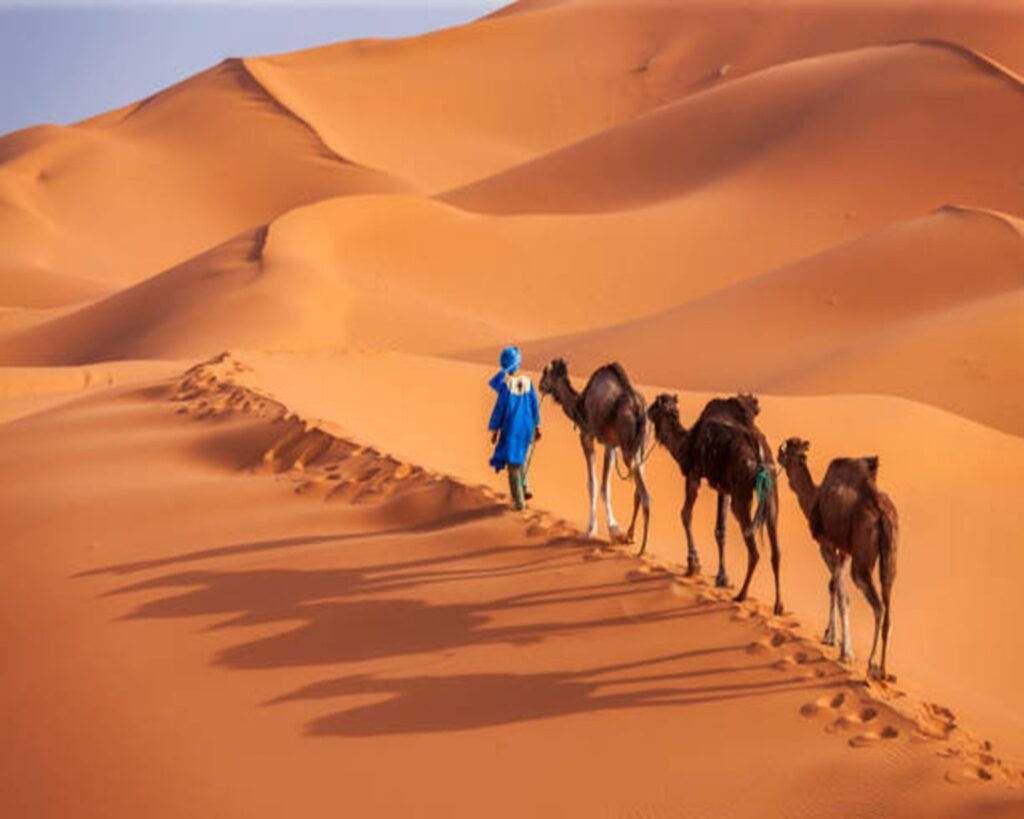 Petit-déjeuner. Le matin, visite de Tamegroute, ville caractérisée par ses ksars fortifiés, célèbre pour sa bibliothèque médiévale abritant une magnifique collection de textes religieux illustrés, de dictionnaires et d’ouvrages astrologiques, dont certains sont en peau de gazelle. Pendant des siècles, et jusqu’à récemment, ce village fut un important centre religieux et culturel, dont l’influence s’étendit à toute la région du Draa et au désert environnant. Continuation le long des grandes dunes de Tinfou et des villages berbères de Tansikht et Nkob. Déjeuner optionnel à Tazzarine. L’après-midi, continuation vers Erfoud avec une halte en chemin dans les villages typiques d’Alnif, situé au cœur du bassin de Mader, l’un des gisements fossilifères les plus riches du Maroc, et de Rissani. Arrivée à Erfoud et départ en 4×4 pour les extraordinaires dunes de Merzouga. (Attention, vous ne parcourez pas les dunes en 4×4, vous arrivez à un point de repos au pied des dunes puis continuez à pied ou à dromadaire – ce dernier en option et avec supplément). Retour à Erfoud, dîner et nuit dans un hôtel. Possibilité de séjourner en camp de tentes avec supplément.